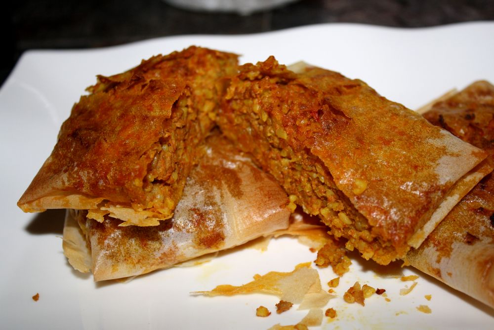 J’avais des feuilles de brick qui traînaient dans le frigo, alors je les ai utilisé avec de la viande hachés mijotés avec pleins d’épices comme j’aime et du boulgour ! Le tout au four pour 10 minutes et le repas est prêt ! Cette petite merveille bourrée de saveurs peut très bien faire guise d’entrée ou de repas.