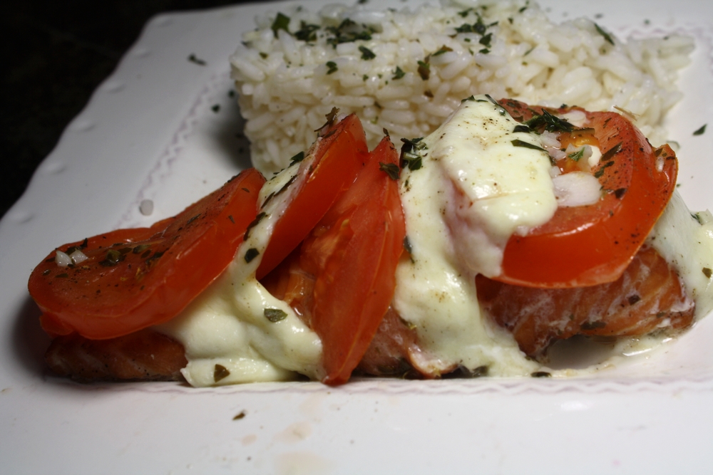 Revenons à notre recette : saumon, mozzarella, tomates, un peu de basilic, de vin de blanc de citron et une pointe d’huile d’olive au basilic & un peu d’ail ! Un régal !