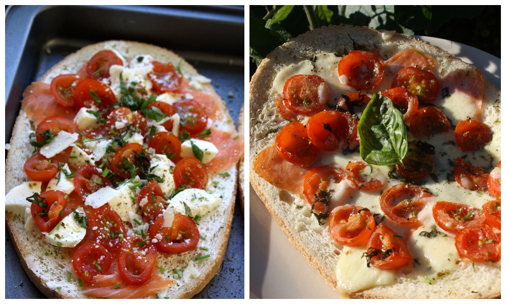 Un grand classique, mais c’est tellement bon. En allant faire les courses, je suis tombée sur des tartines géantes spéciales brushettas, directement dans mon panier. Ce se sont de belles tartines qui font environ 100 gr chacune ! De quoi satisfaire l’estomac des plus gourmand. Ici une version très facile : fromage blanc, citron et ciboulette, du saumon fumé, des tomates cerises, de la mozzarella, du basilic et de l’origan. J’adore. J’ai d’ailleurs fait plusieurs test (vous verrez les photos en fin d’article : poivrons & chorizo ou encore jambon fumé, tomates et mozzarella ou bien crème, lardons, champignons..), à chaque fois, un régal.