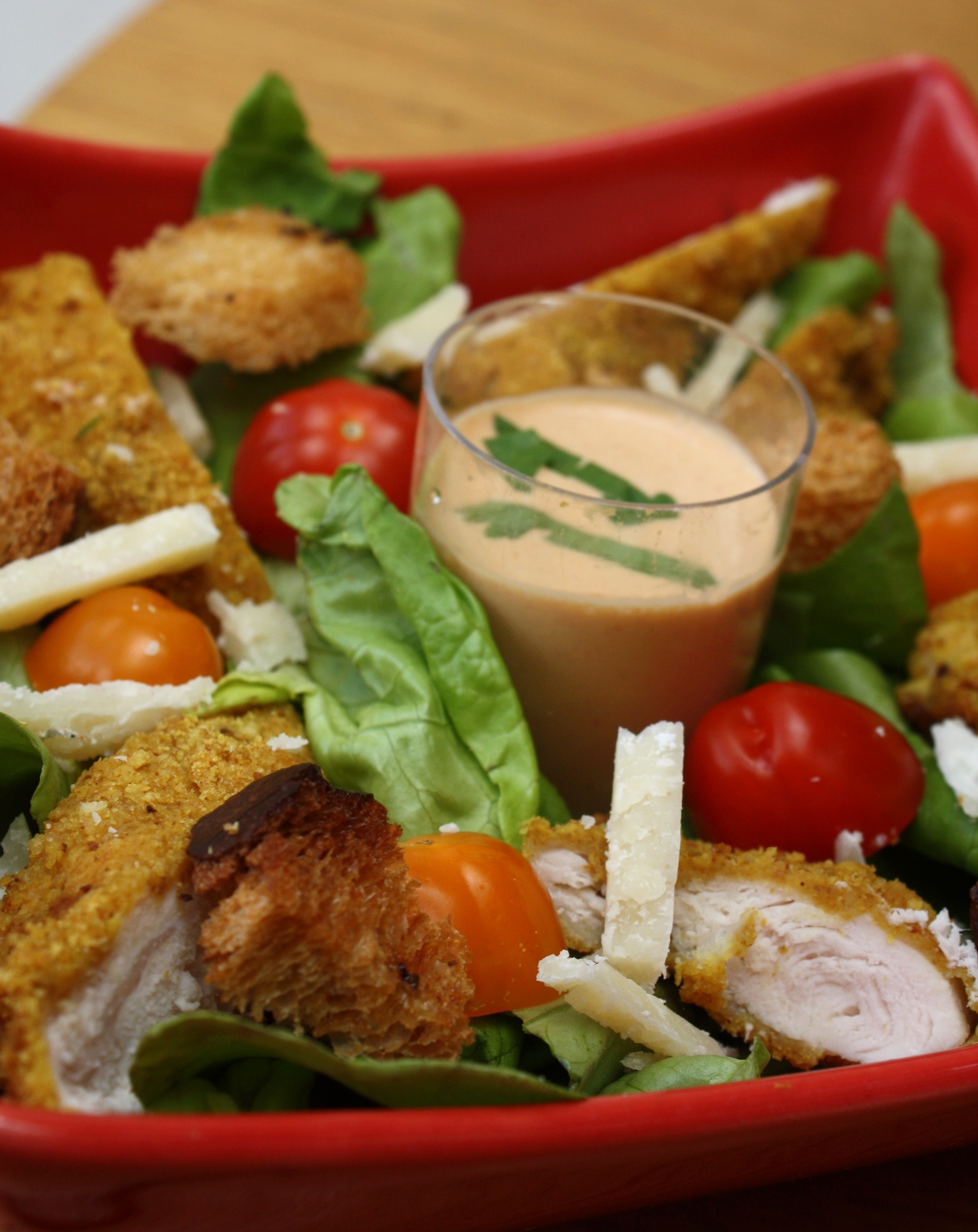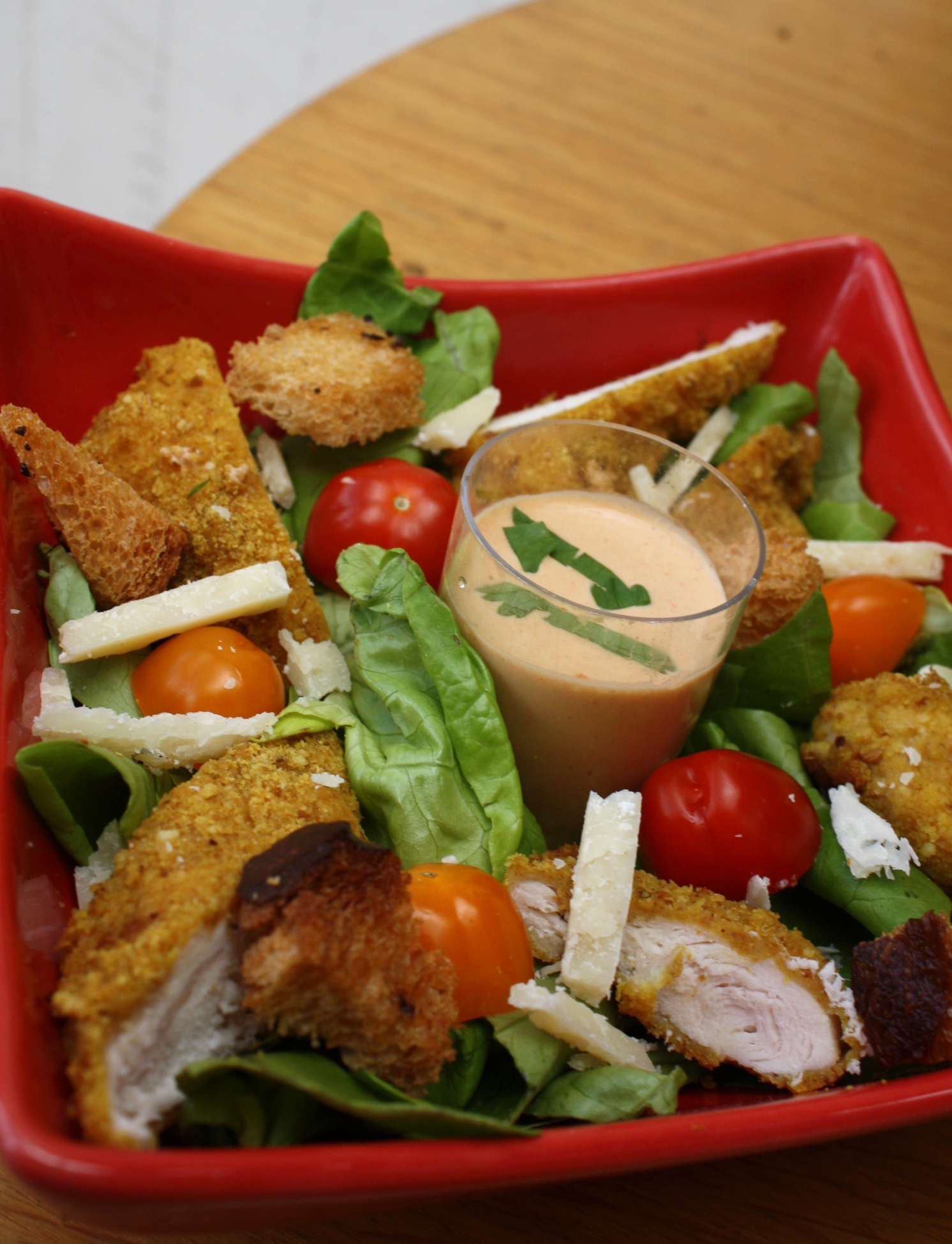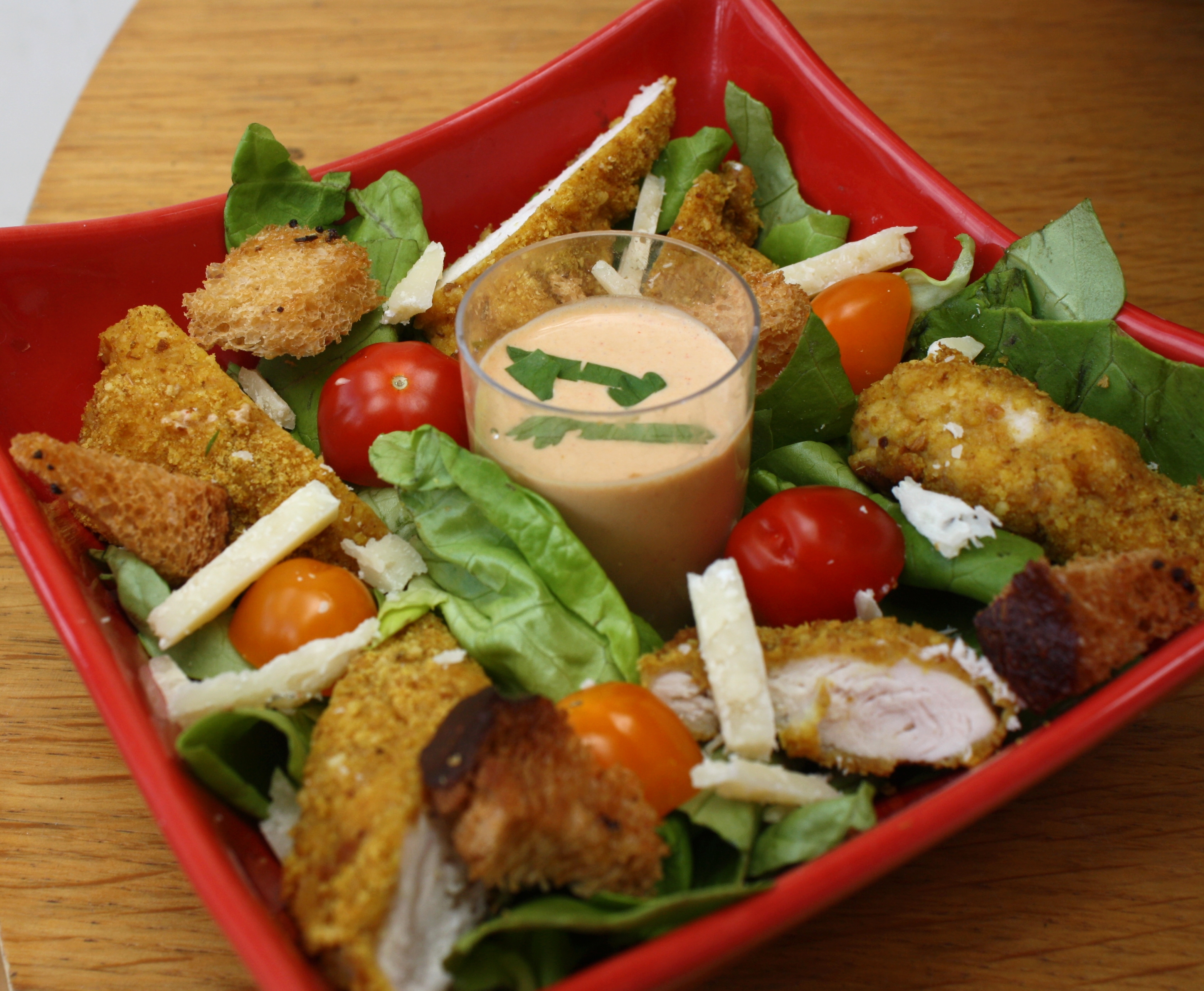 Un rayon de soleil ? Cela me donnes envie de faire une salade, et pas n’importe laquelle ! Une salade que j’adorais prendre lorsque je me rendais au fast food.. la Salade César : rien à voir avec Jules César, même si l’on peut y trouver du parmesan… César Cardini était restaurateur à Tijuana au Mexique, son idée première fut de présenter des aliments dans des feuilles de salade romaine déchiquetées et aillées, ce jour là c’était le 4 juillet 1924, jour anniversaire de l’indépendance des Etats-Unis d’Amérique… Des aiguilettes de poulet pané à la chapelure Curry (que j’ai reçu lors d’un second colis de mon partenaire BLOCH), une délicieuse chapelure qui change de l’ordinaire, un peu piquante avec le curry, un régal ! Quelques tomates cerises, du parmesan, des croutons à l’ail et the sauce César ! Cette sauce est si particulière grâce au Anchois où j’utilise le vinaigre de Xères de mon partenaire Pan y Tomate.