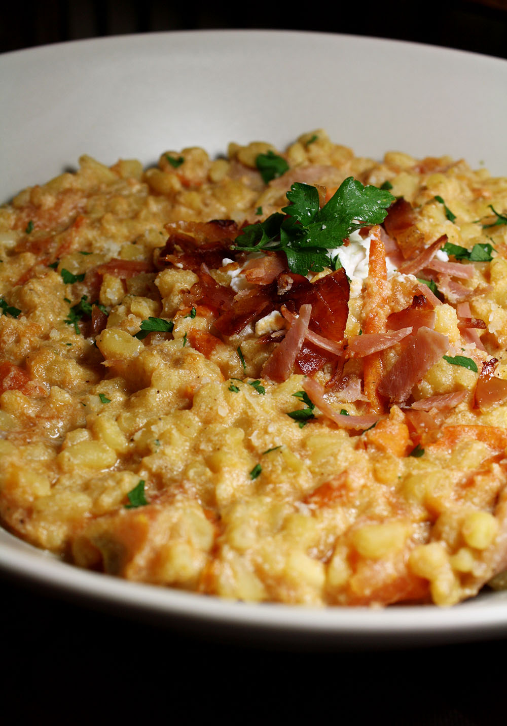 Pour changer un peu des risottos, je fais une variante avec du blé, le fameux blesotto. Vus connaissez mon amour pour ce genre de plat n’est ce pas ? Aujourd’hui, recette très facile, onctueuse grâce à la ricotta, et croquante grâce au jambon cru que j’ai fais griller au four pour obtenir de petites « chips » de jambon. Un vrai délice.