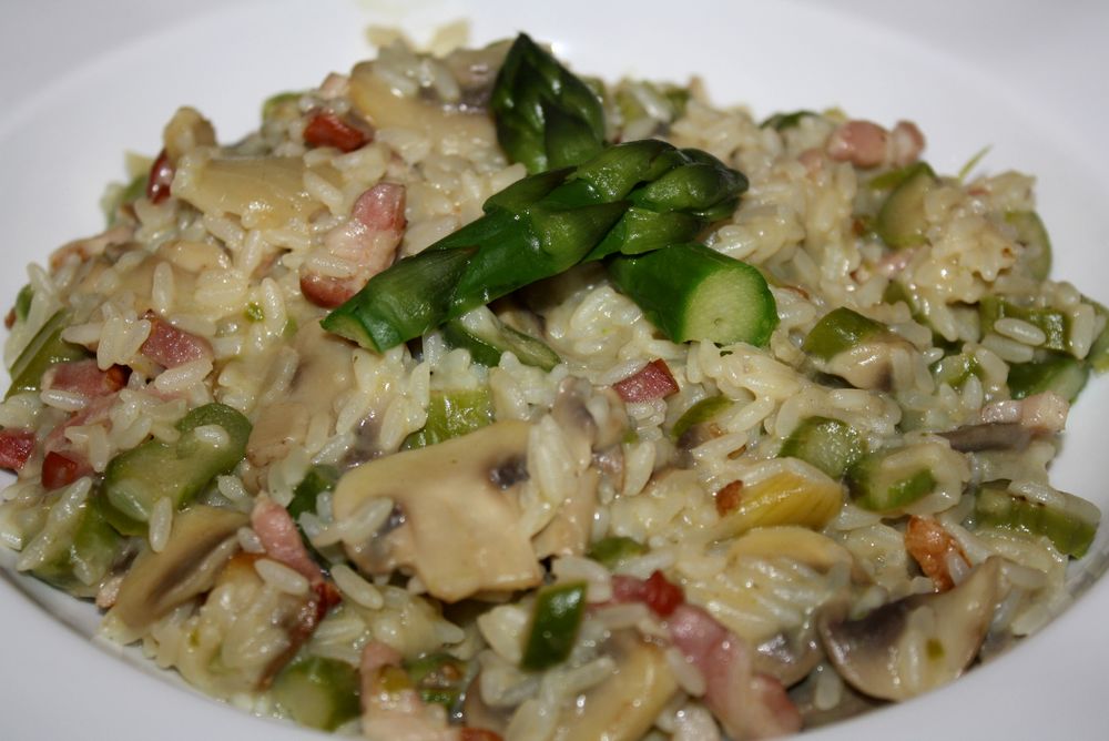 Ce week-end, je me suis fais plaisir ! J’ai rempli mon panier de toutes sortes de légumes ! J’adore ça, des avocats, des asperges vertes, des artichauts (d’ailleurs, une recette très bientôt), fenouil, aubergines, poivrons, tomates, pousses d’épinards, des champignons blancs .. de quoi se faire plaisir ! Donc, j’ai acheté des asperges vertes que j’ai cuisiné en risotto avec des champignons, des lardons et une pointe de crème pour la gourmandise ! Un vrai régal !