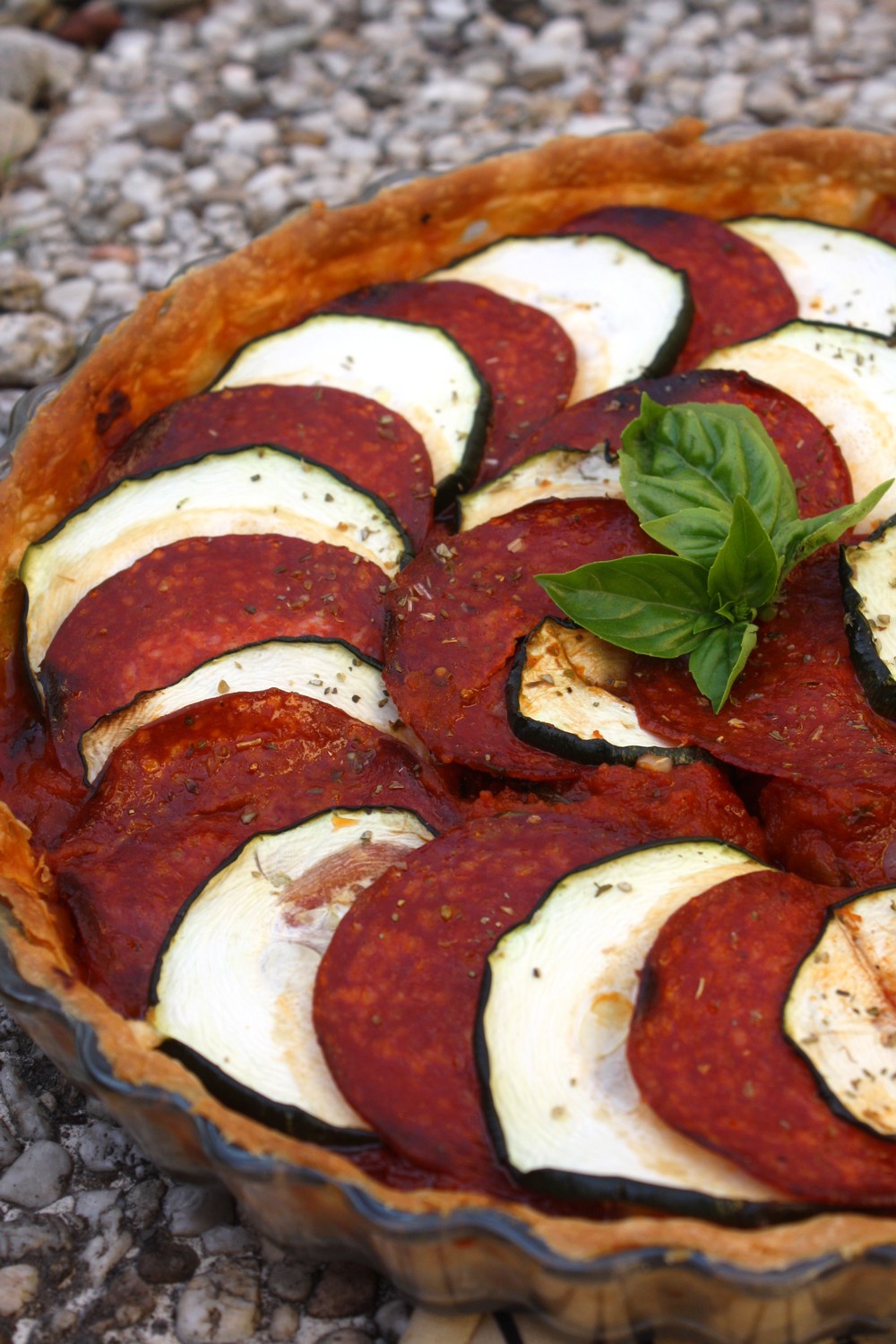 J’avais déjà réalisé cette « tarte » version quiche, avec un appareil oeuf/crème, mais j’ai voulu essayer cette version plus légère. Des rondelles de courgettes & de chorizo, sur un lit de sauce tomates, poivrons ! De quoi régaler ces papilles ! Le tout avec une petite salade, de quoi faire un repas bien complet.